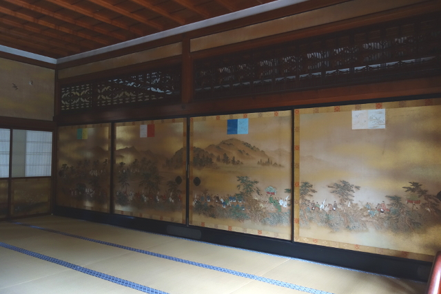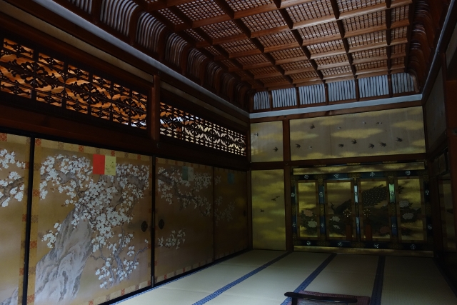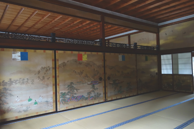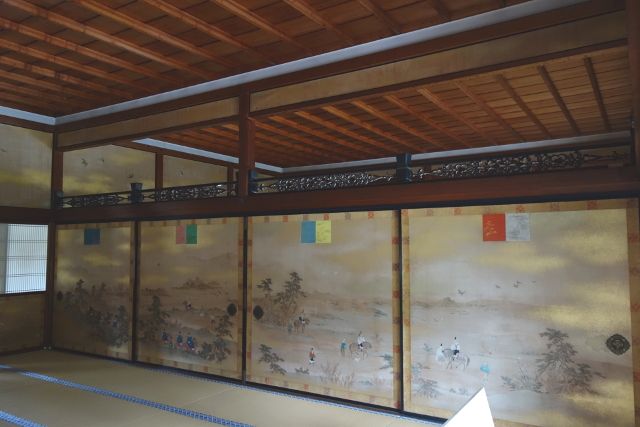 它感覺像融合了傳統的兩種流派,主廳有「寢殿造」的空闊,以障壁拉門虛切出區間,儀典時全面推敞,彰顯其氣派,平時則如我目前所見,將隔門閉合成了一間間長室,展現廳內精妙的襖繪。那些圖繪裡山水淡抹,林樹微點,突顯了其中遊走的細碎小人,他們冠服鮮艷,騎馬乘舟,或許是勾畫著哪位天皇事蹟吧。邊間的風格則略有不同,能見「書院造」的元素加添,壁龕、棚架妝點著牆面,門框有燦爍鑲片環飾,室頂則嵌裝了格狀的弧邊天花板,顯得較為精緻。連襖繪都轉為櫻花繁點,如雪舞空般,華麗非凡。