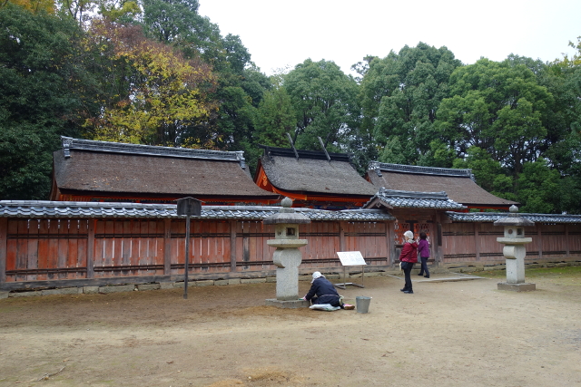 由於牆門所阻,只能微微窺見簷下有著流雲彩繪,本殿檜皮葺頂加飾了交叉千木,粗褐簷面與斑褪外籬反倒成其主要的視覺印象。它在這偏寂的寺院一角顯得寧靜悠遠,不受人跡打擾,僅有位打掃大嬸賣力擦洗石燈,偶爾,才會晃來一兩位像我這樣對各處充滿好奇的觀光客。