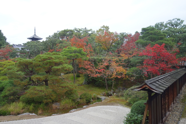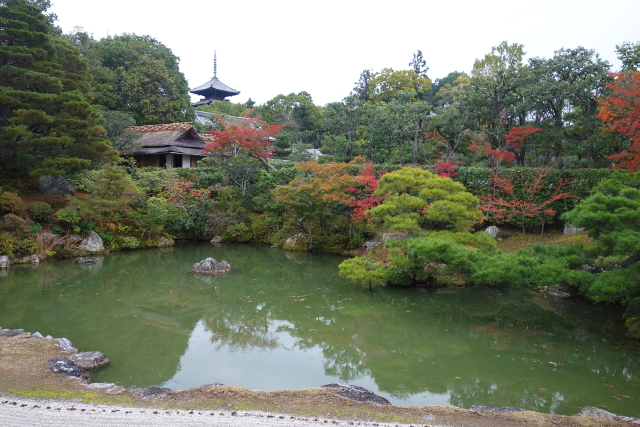 「南庭」的敞闊或許是為呈顯接迎的門面,但順著迴廊繞至「宸殿」背側,望見的景緻又轉了風貌,「北庭」像後花園一般,展著清新的麗景。近處依舊有白沙鋪染,然當與碧池相接,便似灘與浪的親擁,在勾迴間引入池後的林色。那之中有松的蒼翠,當然也摻了點散揚秋意的楓紅,傾伸枝葉將水光映上斑斕的倒影。而再往遠,密林一簇簇形成了築山之勢,並借進院外之景,令人難分界處。隱隱地,還有「中門」朱牆曖昧露著臉,然後是「五重塔」的簷冠穿雲破空。