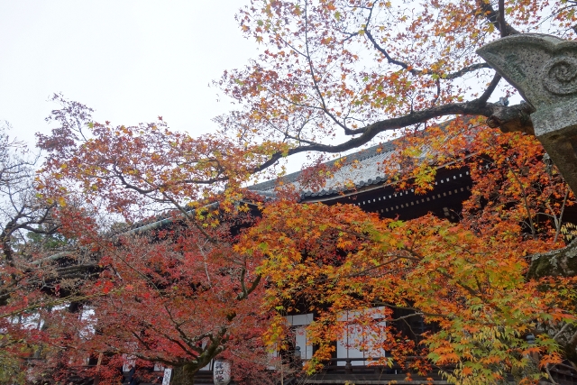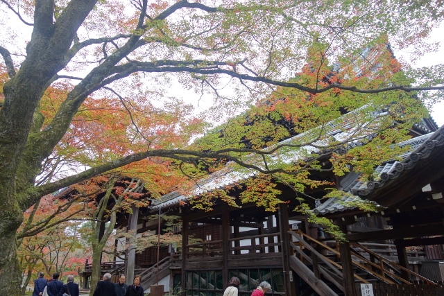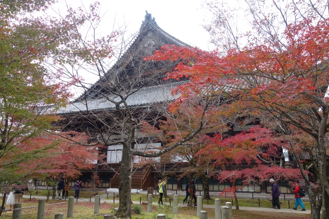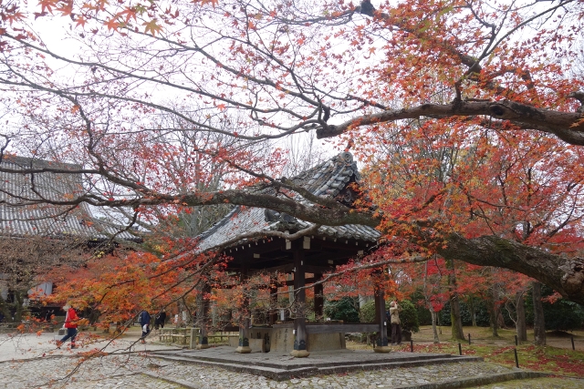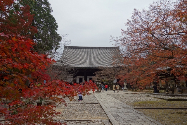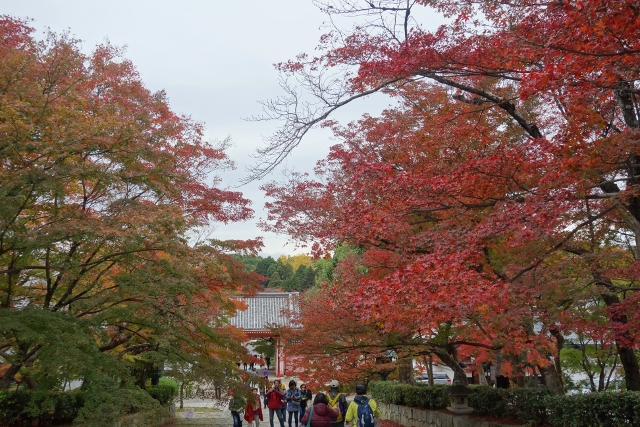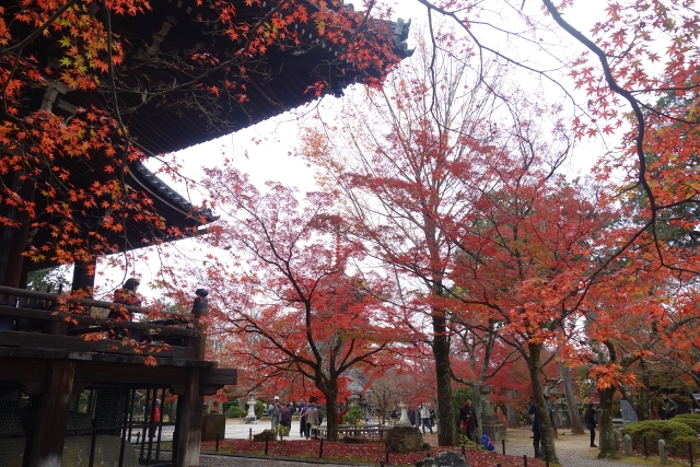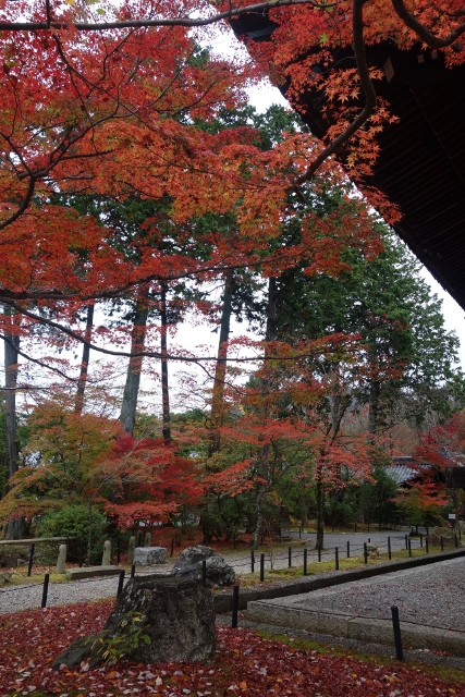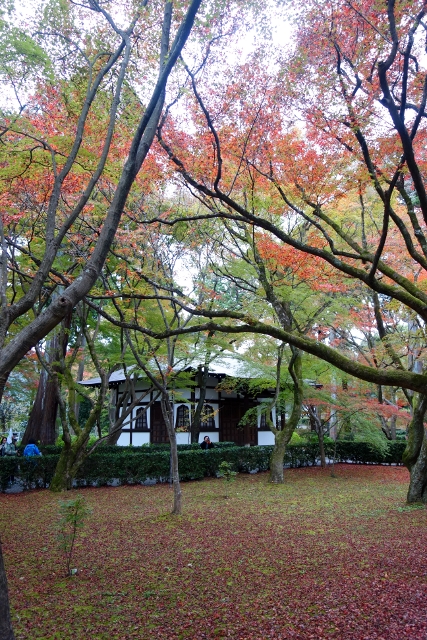 低頭彎腰,我一個跨步竄了過去,而當視野往前抬拓,我發現此側的楓紅又更甚了,一整排依著「本堂」栽植的楓樹如奔燃火炬,向前庭狂野延燒。由於院落觀覽免費,我並沒懷著多大期待,豈料雖不像早上行過的「永觀堂」那樣明艷多彩,倒也有屬於自己的耀眼風姿,綻著入冬前的最末一股熱力。