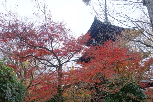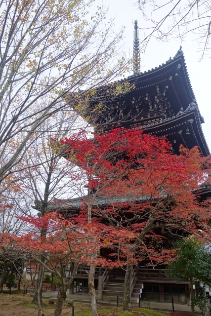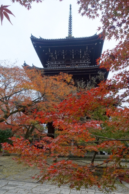 走上主參道,對面區域未如意想循著什麼對稱配置,而是先以敞屋樣貌的手水舍伏踞,然後是三重塔竄劃於空。若在一般時節,能觀賞的或許僅為簷線的錯落,或再多邁幾步,近看層層出跳的斗栱串成緻密勾紋,不過現刻的葉彩卻添了許多值得細賞的元素。可以望橫探楓枝劃過手水舍簷柱,放肆地綻射煙花般的碎密星葉,或是繞著高塔,看群楓於塔邊徐轉色調,有時將它披綴一層燦紗,有時含笑舉臂,在冷鬱的牆額點上一抹紅妝。