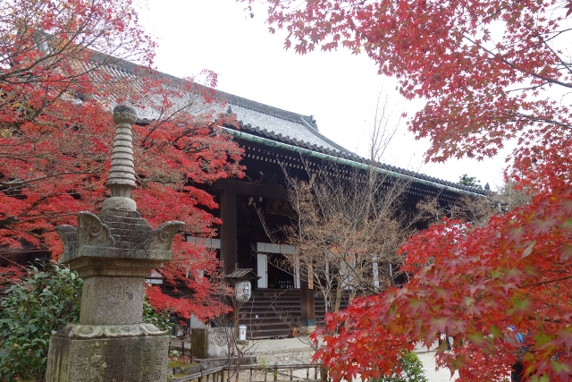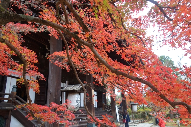 再循著參道逆行,盡頭是「真如堂」的正門,不少遊客或許已填飽肚子,開始一群一群地晃盪上來,藉著閒走賞楓,消解吃下的多餘熱量。從這兒轉身望,視野裡是「本堂」正面的身姿,不過一如其他庭區,朱燦紅豔的楓色依舊成了奪目主角,它們舉臂眨眼,將殿閣逼退為灰空下的幽寂背景。