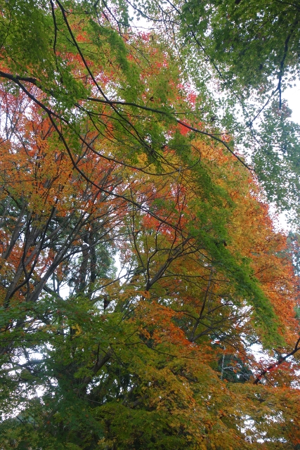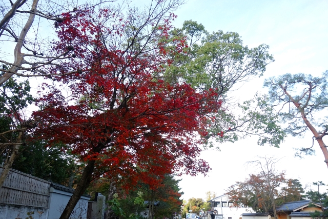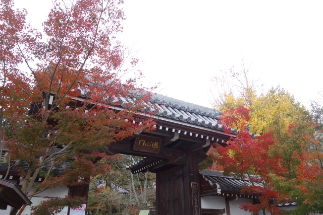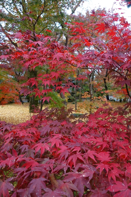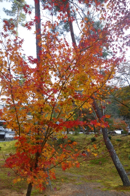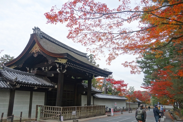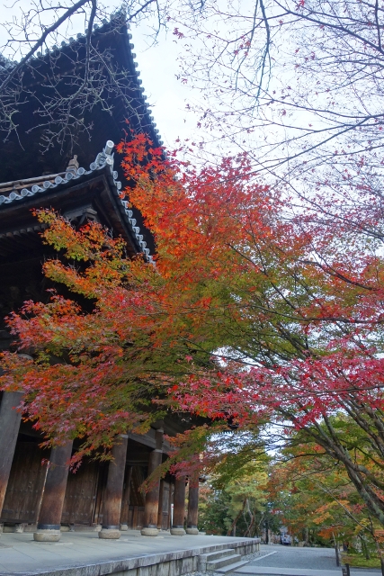行抵了「三門」前的主參道,心中有點澎湃,畢竟一如昨晚的「清水寺」,這兒也是重遊之地。當時雪白櫻枝橫探,半掩著巍峨門樓,現刻已是殘葉空枝,將主色留給前排高擎的楓紅。然就像雙修往往難將兩者同臻極致,由於院落摻了些枯櫻,楓豔之色便少了連綿氣勢。
