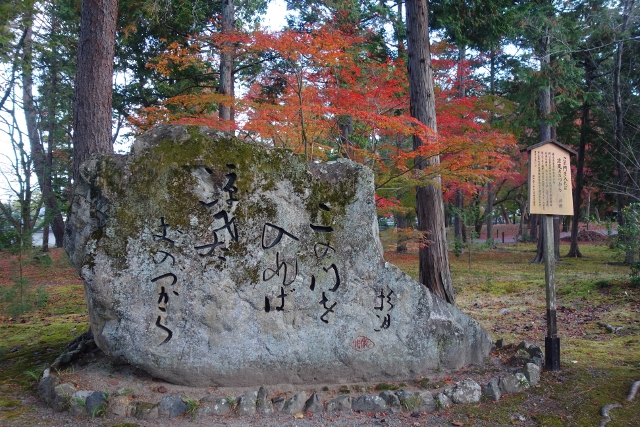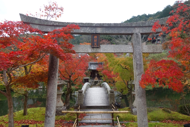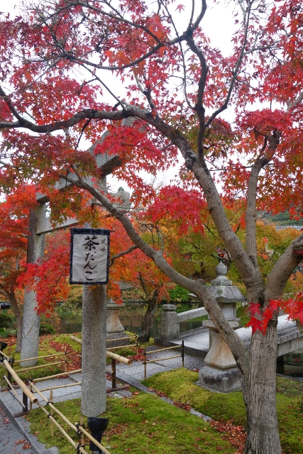 望著拱橋在楓紅中從橫劃漸轉為縱直,我發現一座石砌鳥居張揚於岸口,頂額書著「辨財天」,看樣子小島上的果然為神社,奉的是這位代表財富與音樂的女神。橋端有矮籬,禁止遊客誤入,這樣也好,讓大夥照片裡少去雜擾人跡,僅留秋季純粹的火熱顏色。而從鳥居望進的景框亦別有情趣,橋身的流弧、石燈籠的古意,兼著楓豔在旁的綴點,很令人流連。