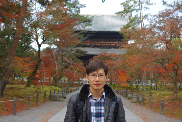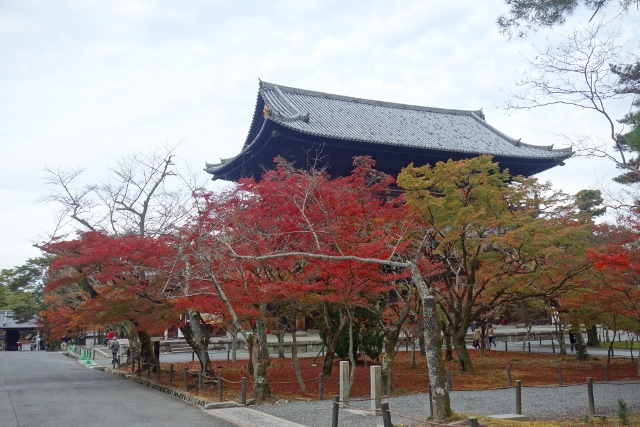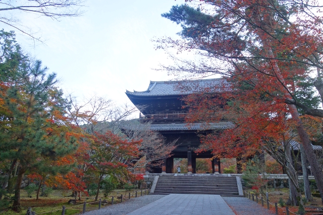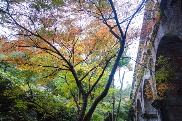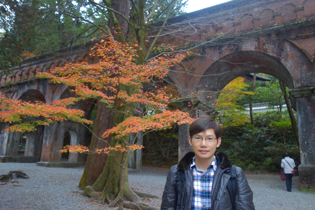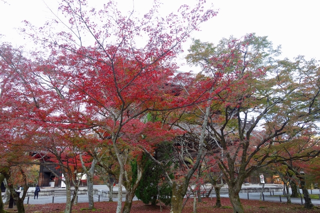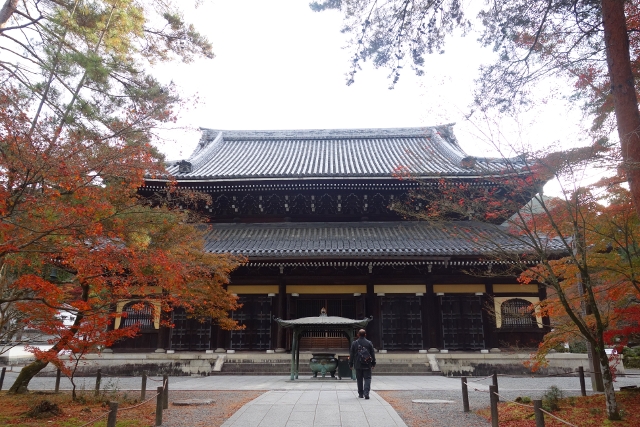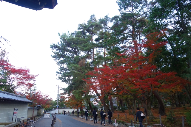 等到公車,坐了幾站至最近的岔路口,我下車往裡拐,目標不是「永觀堂」,而是附近的「南禪寺」,它的主院植楓甚多又不收費,便預留了些時間給它。由於來得早,沒有多少觀光客與我同路,見到的幾乎都是正要趕赴學校的中學生,看著他們揚散的稚嫩青澀,感慨之餘,也覺得拿著相機的自己頗為突兀。
