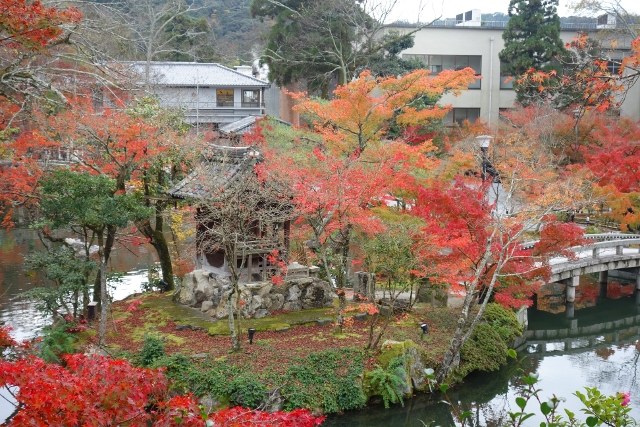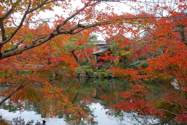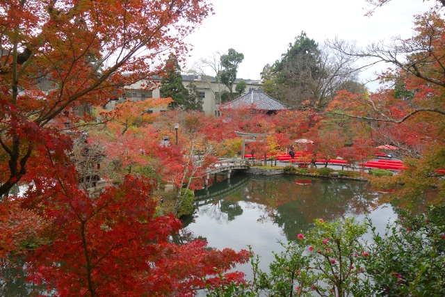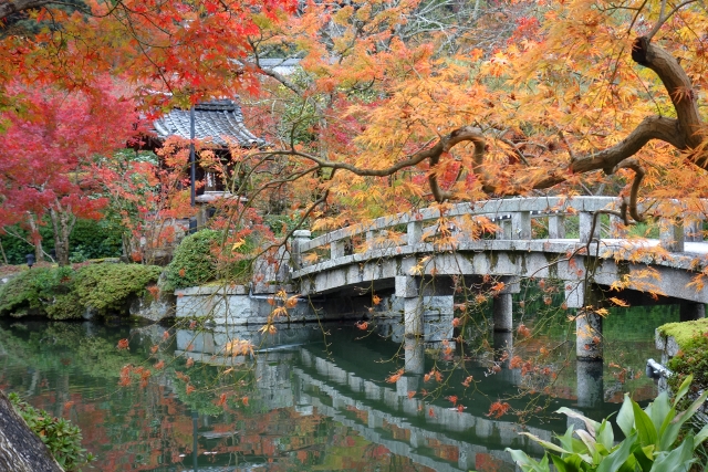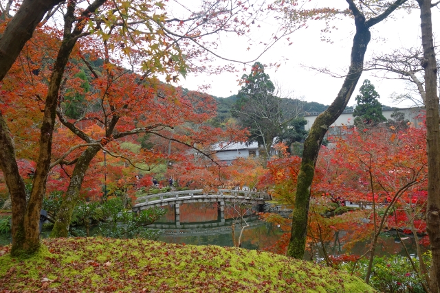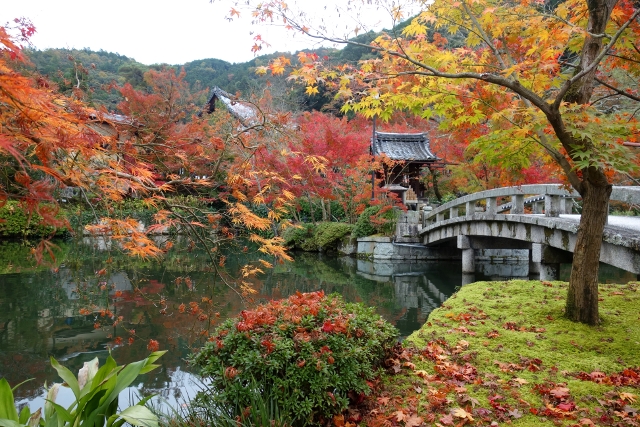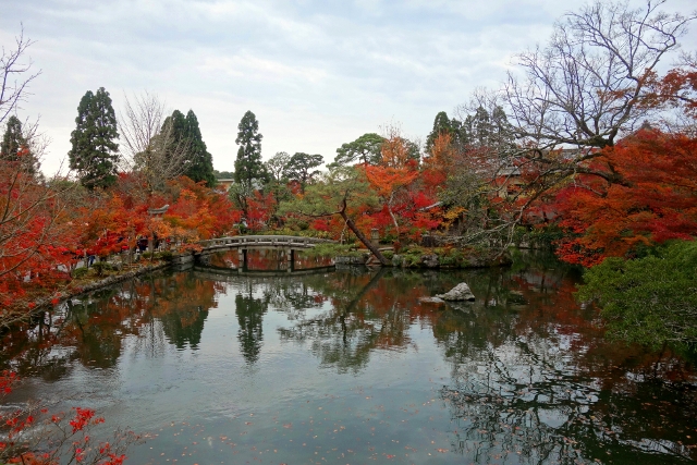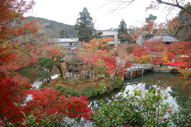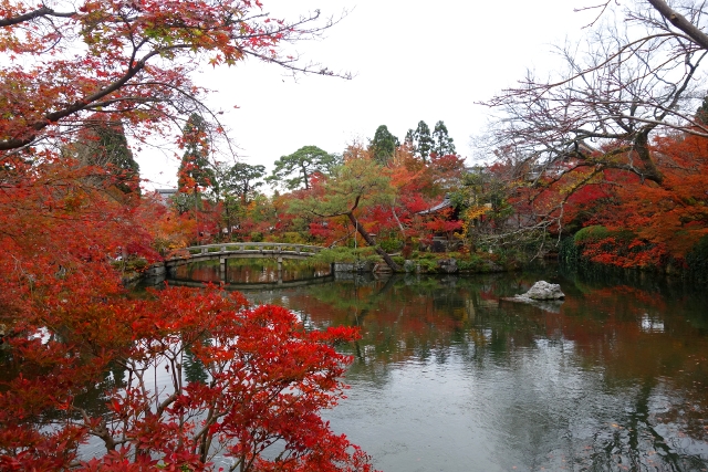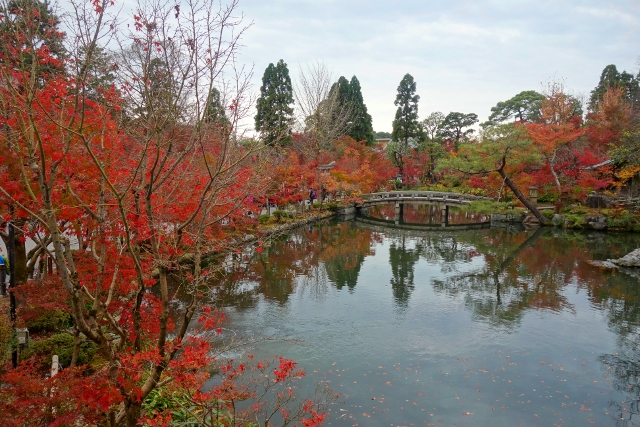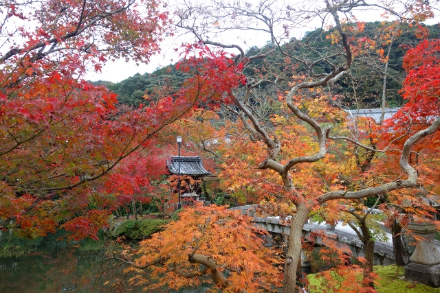 感嘆過後,我走上「極樂橋」,將自己轉向院裡最為經典的視角。這兒池水開闊如鏡,楓林密織為繁麗的飾框,通往「辨財天」的拱橋成了畫面焦點,在水光中劃出兩道淺淺對稱彎弧。群楓則傾身往靜池探長,彷若拋出彩豔的水袖,縱使天色灰濛,少了點舒朗的蔚藍,依舊展露笑顏,歡歌著入冬前的最後一個慶節。