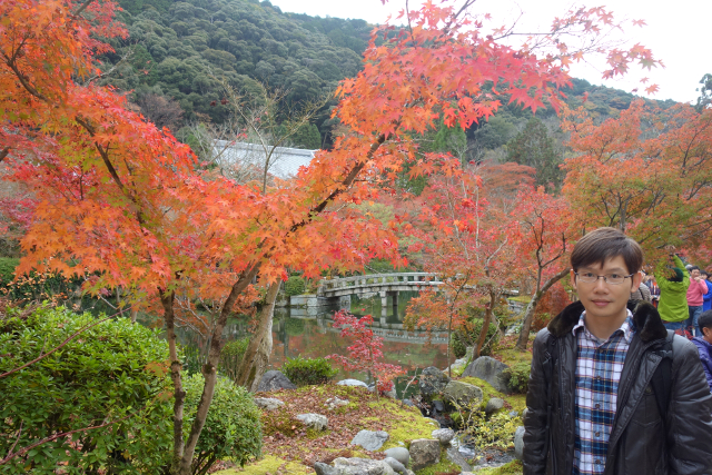 而當我好不容易推進至窗口位置,望見的景畫果真令人訝嘆,池中苔島孤立,石台上有小屋像是座神社,一道短橋微微點躍,將岸邊的楓舞引進島岩,於是視野裡滿是不同彩度的灼炎,帶點輕揚的橙紅、散發驕氣的絳紅、略顯深沈的殷紅,像是在展現光譜變幻的無限。我不停地按動快門,想盡量多框入些景緻,幫記憶留住這片撩目的繽紛。