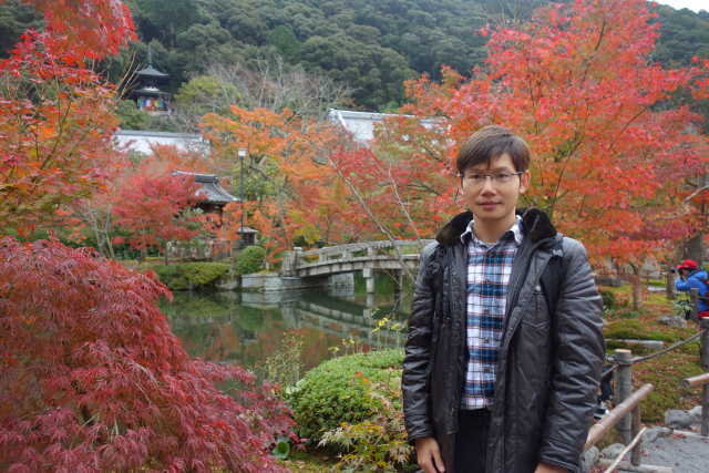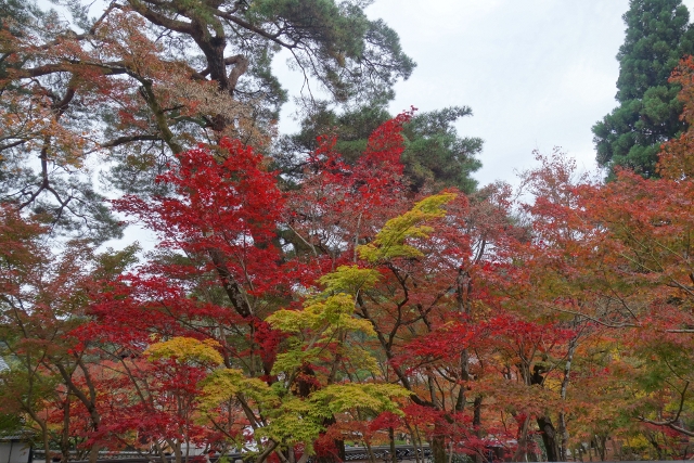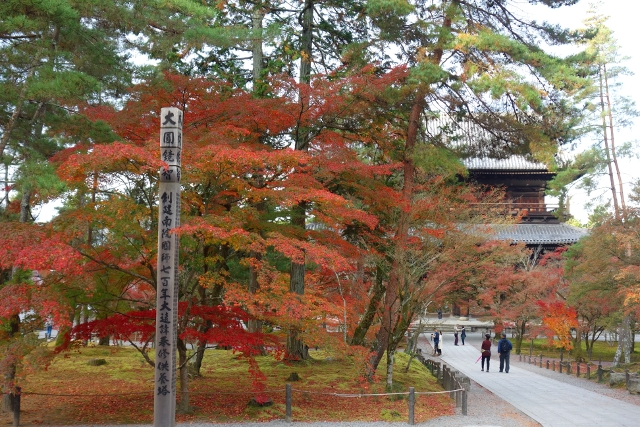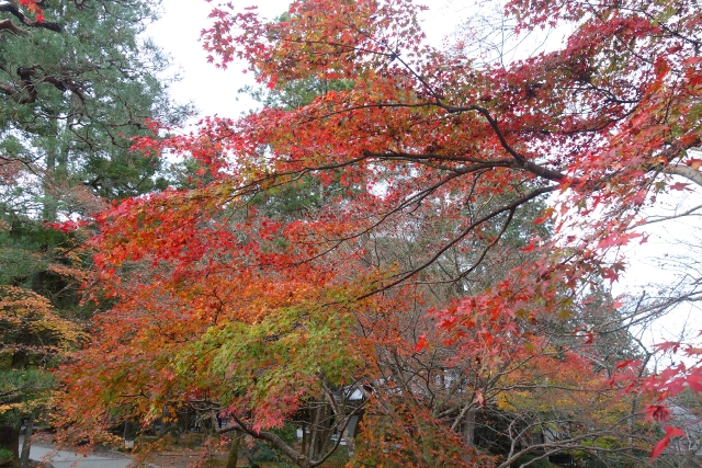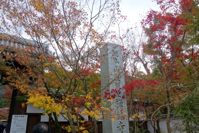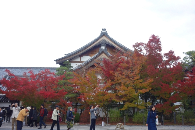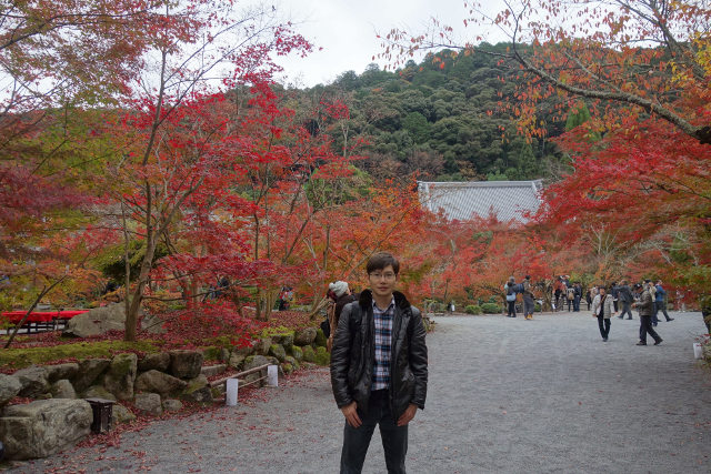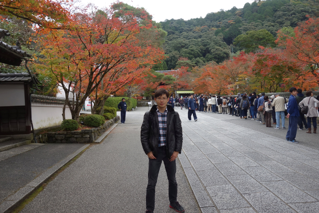 循著街道往北走,身邊湧聚的遊人漸多,似乎都跟我同樣目標。而當「永觀堂」總門前的碑石現出,果然大夥都不約而同拐彎進院,不時還有工作人員呼喊著,引導一輛輛大型遊覽車駛入。櫻花季時,我曾從「哲學之道」行經此處,碑石旁的楓枝荒寂,但現已在我眼前散展出很美的漸層。順著它的招引,我穿進總門,而才剛步入,參道旁的景色頓時令我訝目。茂密的楓樹越過簷牆高偉展立,探伸出連綿的楓葉,前兩日寺社的楓紅疏落,偶爾覓見便讓我驚喜,這兒卻是毫不吝惜地潑灑顏彩,不愧為楓之名所,光是入口就令人折服。