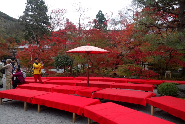 或許寺方也有同感,在旁設了大片茶席,竹籬內紅布座凳併延,幾柄焰傘張舉,襯和著環圍的楓枝,讓遊人因觀景而生的悸動益發激越。稍微往林子裡走,有條岔路通往名為「畫仙堂」的屋閣,其外觀小巧方整,疊簷下圓窗作飾,屋旁還有兩尊小地藏頸圍紅巾,模樣趣致。順著他們的招引,我拐去門前窺看,見裡面有著畫作展示,便索性進去細賞。
