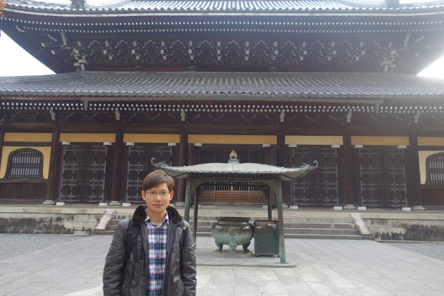 走到「三門」下的階台我往上看,它依舊像位入定老僧,一身古樸褐袍,端坐思禪,四季的流轉在他眼中僅是雲煙。但對我而言,看見了它,便想起我曾經悸動繞行於樓上環廊,倚著欄木,望櫻花如雪覆,眺瞰屋舍沒隱於遠山。現在從上俯望的景緻又是如何呢?應該為另種火熱風情吧。