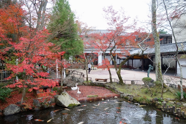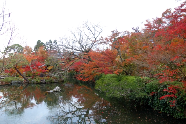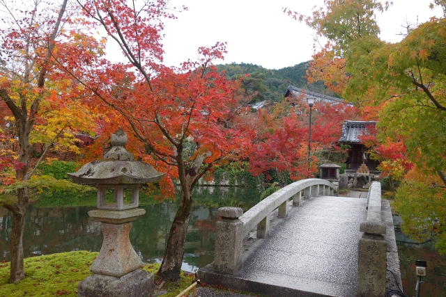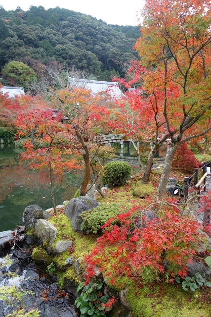帶著疑問走出後,我折回池岸,繼續循徑而走。步徑在池尾轉成「極樂橋」劃水而過,但在上橋前,我卻發現前方以矮門相隔的居然是間幼稚園。「放生池」的一角探進園區,有白鵝錦鯉悠遊,趣致雕像旁是寺院彩楓與其共生,儘管園區中庭不大,卻將「永觀堂」的秋色借景而入,顯得燦美且遼闊。然小朋友完全不以為意,僅只嬉鬧著、追逐著,倒讓人不知該羨慕,還是埋怨他們暴殄天物了。