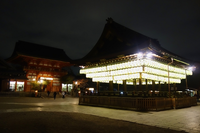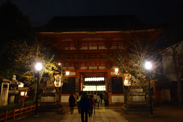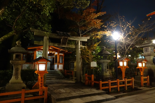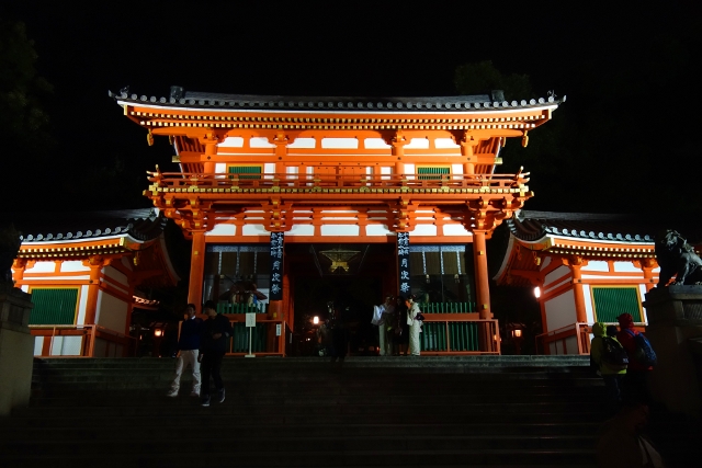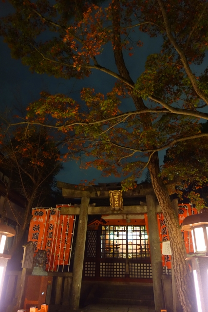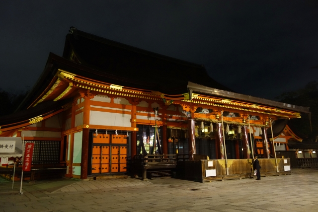 匆匆離開了餐廳,我走向「八坂神社」的西樓門,這神社我曾於櫻花季到訪,不過當時是白天,沒機會見識它晚間的模樣,而現刻在夜燈的投照下,光是樓門就相當亮豔了,朱紅椼架於淨牆交錯出鮮麗的彩度,踞立在階台輕易便能招引遊人目光。走了進去,串接諸多小神社的參道幽闃,由上了紅漆的木質立燈指著路。循徑轉到最裡,映入眼簾的自然就是「本殿」,它一如過往記憶裡的恢宏,闊簷揚展,木椼交劃,前探的「向拜」下鈴繩懸垂,然或許大夥都湧去「清水寺」了,偶爾才有幾個信眾過來搖鈴默禱。