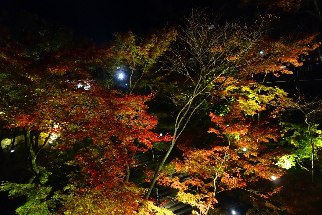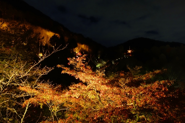 還正出神時,旁側傳來呼喊,聽不懂那日語在說什麼,但開口的像是工作人員,感覺應為閉寺前的提醒,於是我邁開步伐,順著行道迂迴往坡下走。這麼走著,便也是穿入剛剛由上俯瞰的楓林,看著這些斑斕漸浮於墨空,感覺又不同了。一路行至坡底,我來到很熟悉的「音羽之瀧」,這兒同樣是觀光客的駐留之地,望著三道細泉自簷下拋墜,擊出細細碎碎的清音,我好像也見到半年前的自己在那兒持著長勺,淨手、擊掌、禱唸,而當時的祈願算達成了嗎?其實我也不知道。