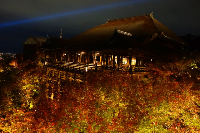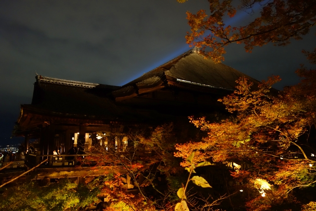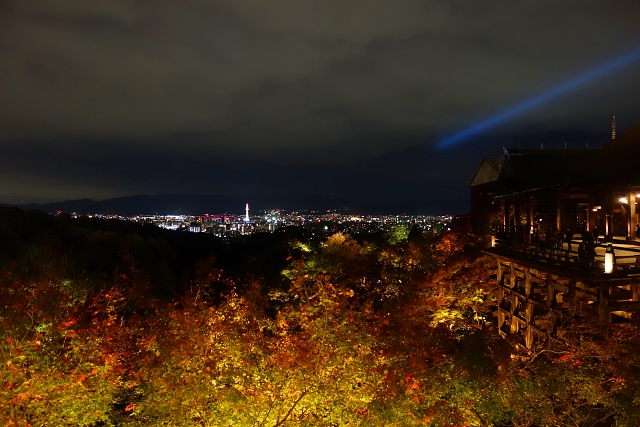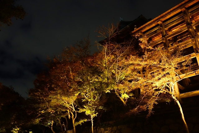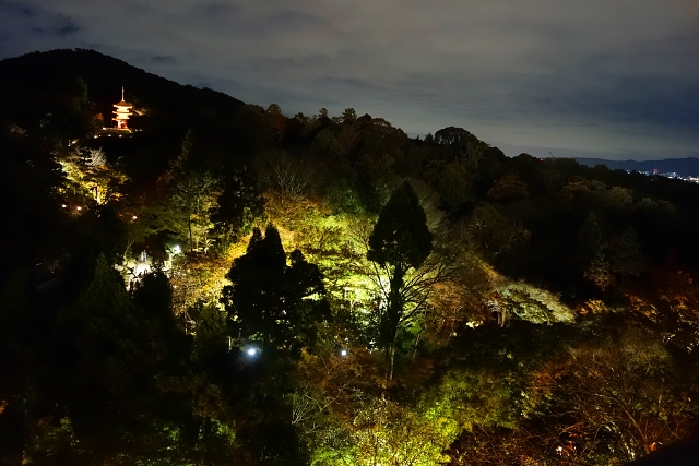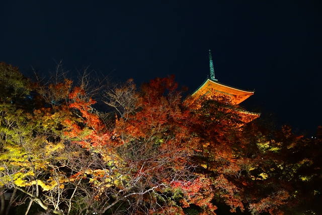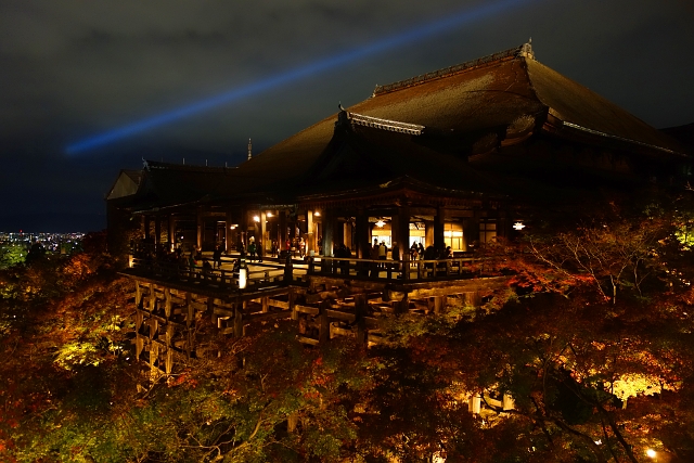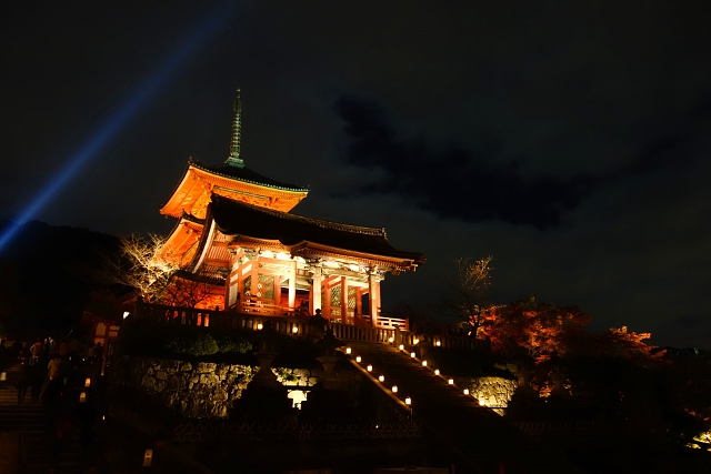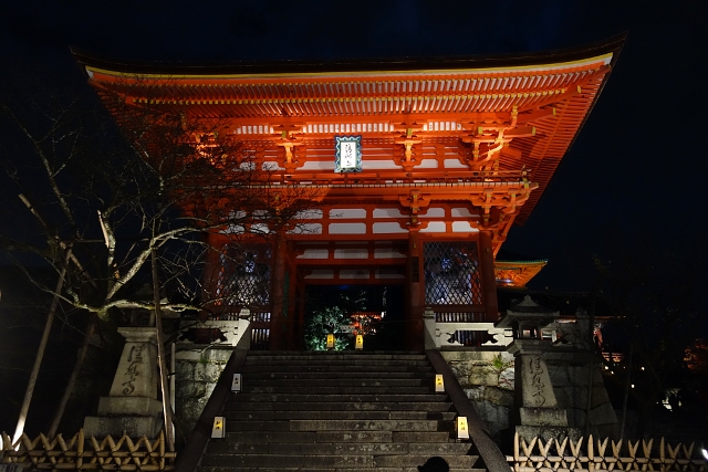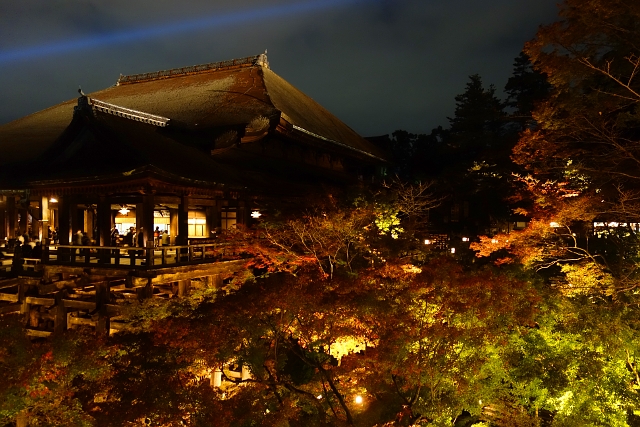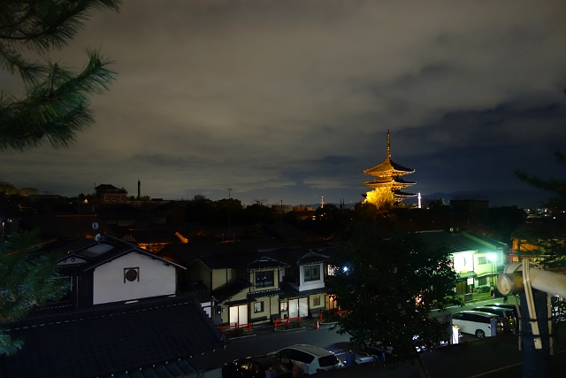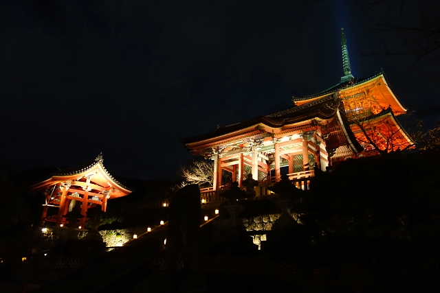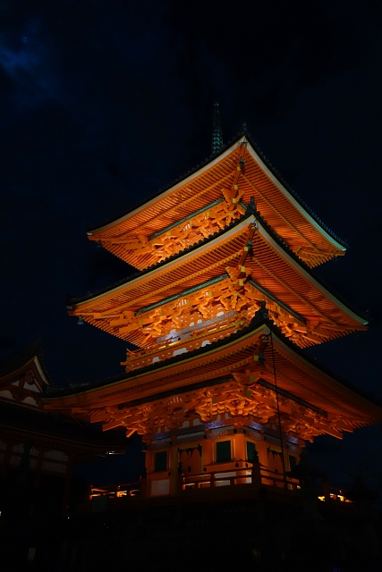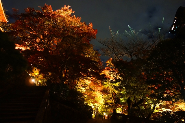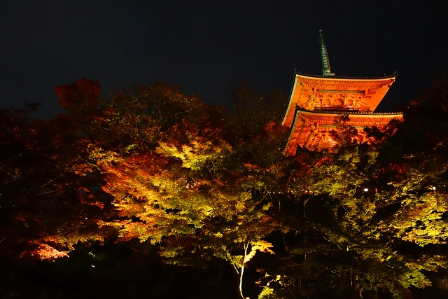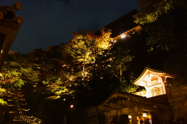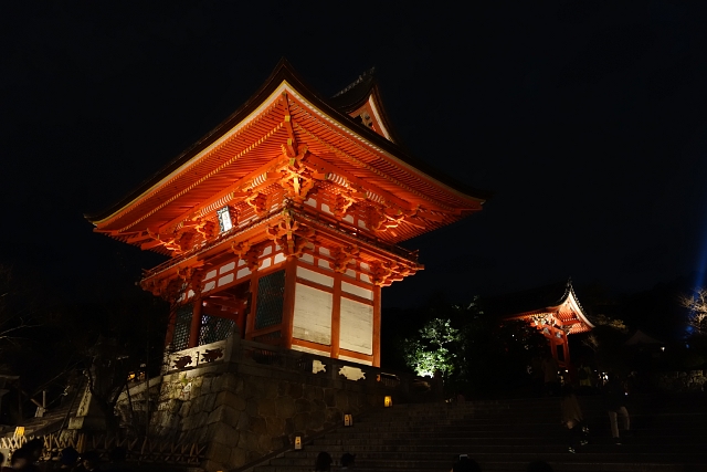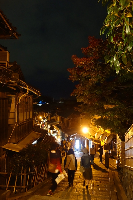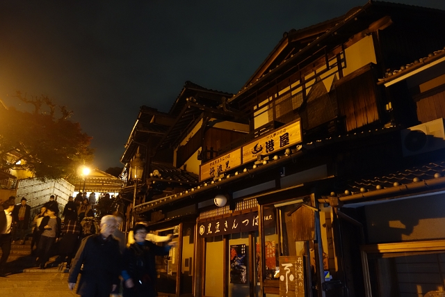 回轉身,在這居高之地能見到不遠處的「八坂塔」,再往前是通往「清水寺」的「二年坂」、「三年坂」,多數店家已半掩簾門,作著歇息前的收拾,但遊客仍然熱絡,東望西探、交頭接耳,感受町屋就算入了夜也依舊柔媚的日式風情。從斜坡轉上了階梯,熟悉的感覺越來越盛,它催促著我的步伐與心跳,而當轉過幾個以楓為飾的應景店舖,我終於再次見到了「清水寺」的「仁王門」。