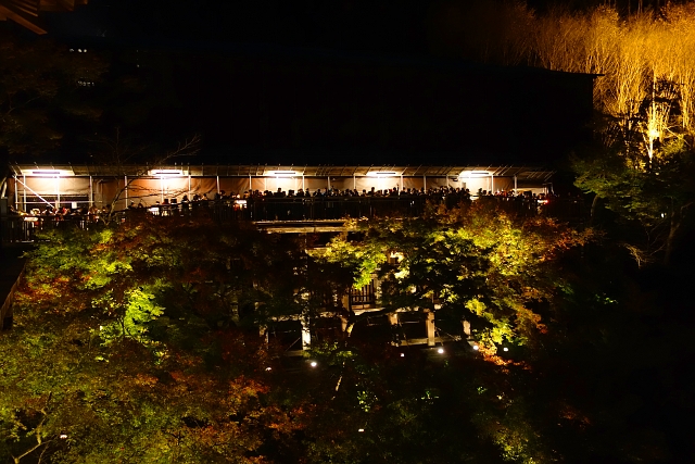 視線瞥向左,「阿彌陀堂」與「奧之院」看來仍未維修完畢,無法見到真實的巍峨模樣。但院前密密麻麻往舞台拍攝的人潮倒是相同,也讓我期待起從那邊望來會是如何的景貌。走出了「本堂」,身處的小院頗讓人驚喜,有滿多彩度相當高的楓葉,隨著人流的推進,我看著這些楓葉從點綴,慢慢轉為環擁,最後將「本堂」烘托出它最經典的畫面。
