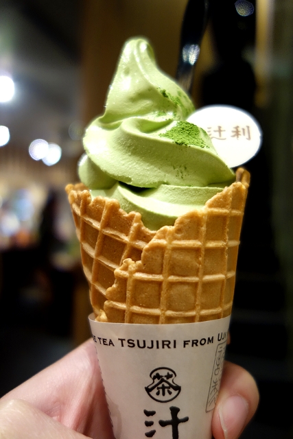 然當結帳時,眼睛又不由自主盯在價目板上的霜淇淋,於是接續的結果可想而知,是我挖著灑上抹茶粉的抹茶霜淇淋,以輕快腳步往前行。但才吃到一半,便望見極可能是在跟它打對台的「祇園辻利」,想進去逛逛,又擔憂手上這物事會觸怒店員,還好半遮半掩溜進後沒受到什麼為難,大概看我挑了些要應付同事的捲心酥,便假作無視吧。