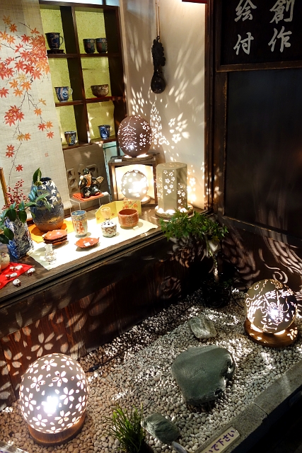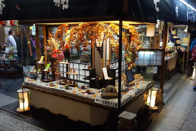 晚上的目標是「清水寺」,離這兒還很遙遠,若要省時間應該在附近找公車搭,但想想我又不趕頭香,索性就沿街散步過去。上次來的時候,我多在「祇園」東端遊走,現刻所處的西端倒是第一次踏足,幾公尺遠的地方有個桃山風格的樓閣,山牆下唐破風勾曲,兩側紅燈籠書寫著「南座」,看來是個上演傳統歌舞的劇場。好奇窺探幾眼後,我繼續以閑散的心情往前走,身旁櫥窗五顏六色,但都沒什麼東西勾起我的購買慾,不過當看到「辻利」這招牌時,我就像被催眠般停步了。