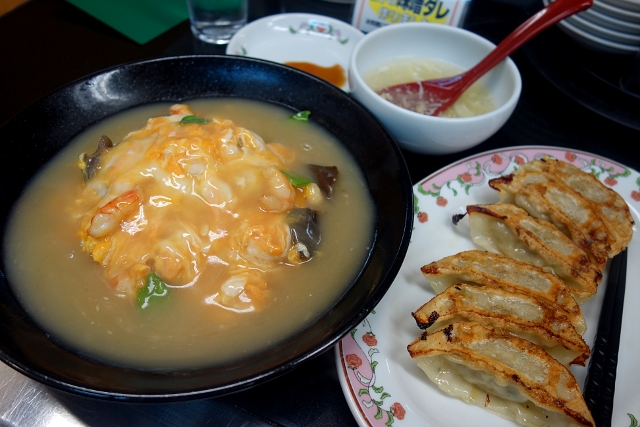 盯著菜單上的撩目品項,我再度陷入難以抉擇的困境,招牌的煎餃是肯定要的,但看似新品強打的天津飯也很誘人,勾芡過的蝦仁蛋花襯上些木耳配菜,光是照片便令人食指大動。最後,我豁出去了,就飯加六顆煎餃吧,希望自己不會撐死。
