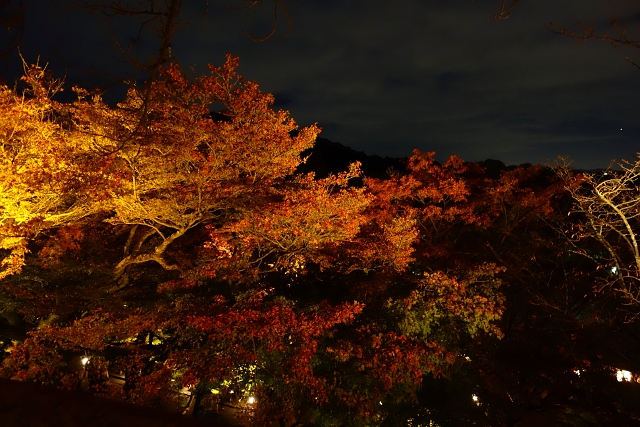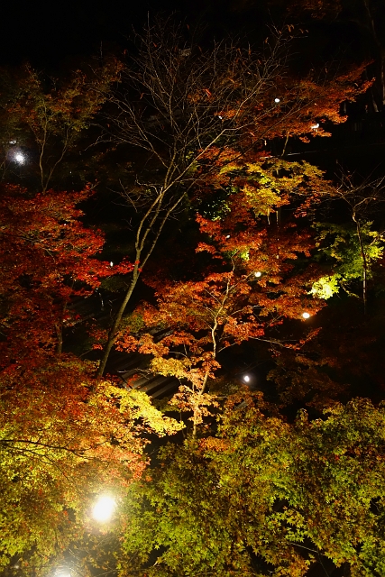 踩著階梯,我徐緩往上爬,從宛如左右雙衛的「鐘樓」與「三重塔」間穿至殿舍區。不過這些屋堂已隨著入夜隱去輪廓,將主場留給坡間的彩楓,雖非是一致的緋紅,仍有半色碧翠待轉,可是在燈光的加持下依舊極具氣勢,能與之爭妍的,應只有斗栱繁密交錯,宛如綴了一身珠翠的「三重塔」吧。