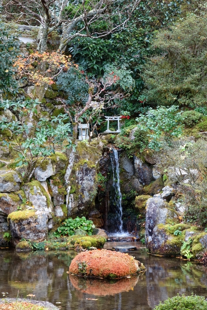 園裡的「心字池」橫陳,池緣曲折,好像真是仿擬著心字模樣,隔著池水的碧林錯落有致,右側孤松挺立如鶴昂首,左方地貌隆起成龜蟄伏,是很典型的龜鶴佈局。我循著池緣砌岩端看,望石燈籠挑出峰巒,將山勢拔升至坡頂石塔,再讓水聲引導著,穿過縮渺鳥居神社,隨瀑流落墜,與錦鯉同游。