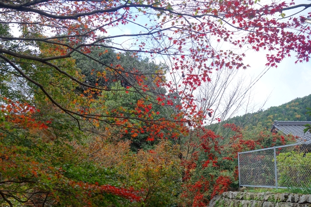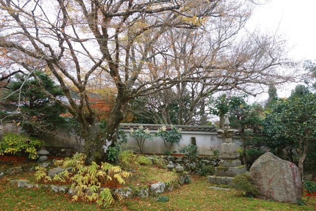 而在這滿院斑斕中,除了柿樹,最亮眼的就是與之相對的一株楓紅了,枝枒不知什麼原因被修得殘短,但依舊盤繞著豐盛紅葉,而且是鮮鮮亮亮讓人忍不住想發出讚嘆的那種。旁邊還有塊巨碩石碑與其相映成趣,當中主要的三個漢字我只認得出「梵音」,最末的據說是「寂」,「梵音」與邊側的「魚山」、「聲明」交互對應,書刻於此的象徵之意可以理解,但後面再接個「寂」字,佛理未通的我就得仰仗腦補能力了。或許是暗指梵音導引的空無境界吧,當梵音聲寂,靈台也隨之清明。