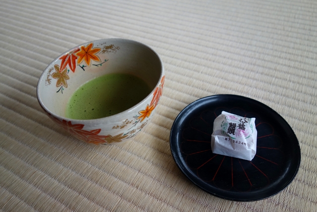 出神定觀之際,大嬸持著托盤帶笑而來,將抹茶及和菓子置於我身前,該是為了呼應時節,還選用了楓葉彩飾的茶碗,並將瑰麗花紋轉正與我相對。此刻已過正午,和菓子便如及時雨,剛好能安撫我的轆轆飢腸,但大口吞咬過於粗魯浪費,便還是望著景,一點一點嚐著不會過膩的甜餡,然後品味抹茶那帶著微苦的醇香。