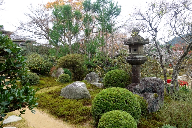 茶香將園景薰得清煦,儘管時節已漸入寒冬,眼前依然豐沛著淡淺略異的碧翠,當中點灑著微微金橙。不過當視線被彩葉勾縛,我才發覺邊處高擎的枝傘其實是楓樹,只是豔紅者早已翩落,僅存色澤疏淡的黃褐餘葉。然經歷了前三個院落的淬煉,這樣的失落已無法再摧折我心情,我僅輕輕嘆了口氣,將抹茶飲盡,起身往主園行去。