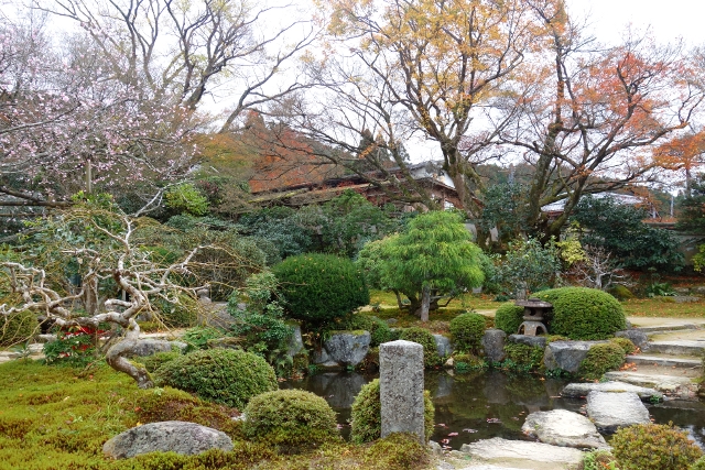 主園其實就是舊時「理覺院」的庭園,不知是否為營造出柳暗花明又一村的效果,園前不但以矮灌木及斑岩擋列,又植了一排瘦瘦高高枝葉開展如蒲扇的樹種,讓人一時難窺園裡究竟。不過當迂迴繞了進去,望見的景色卻很讓人驚喜,手邊開綻的居然是櫻花。