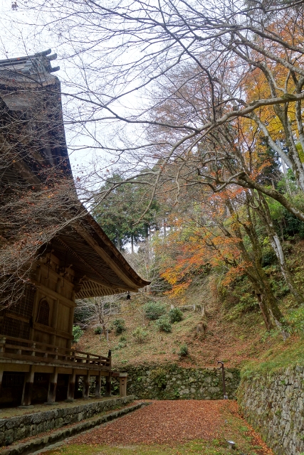 走到了殿前,本是該上階參拜的,但一個轉念,又踏向堂外的步道,想先尋尋是否還有動人的楓景。根據先前翻過的遊記照片,「本堂」兩側是楓樹最茂密之處,不過這時僅剩滿地的落葉,而且是完全失了血色,亁亁枯枯的那種,使得我只能打量起身旁的殿牆。或許少了些雨雪的浸滲,牆色偏向灰白,在窗框外的空餘處能窺見木紋自然的繪染。