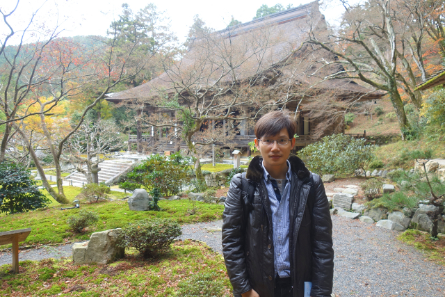 園裡靜寂,耳畔只有水聲的低吟,或許是少了大量楓紅的綴點吧,遊客多半不願破費來此,反而保持寺院的清幽,然這也導致找不到人幫我與園景合影,當抬頭尋望,望了半天才有個年輕男子從「本堂」晃下,像要往這兒來。