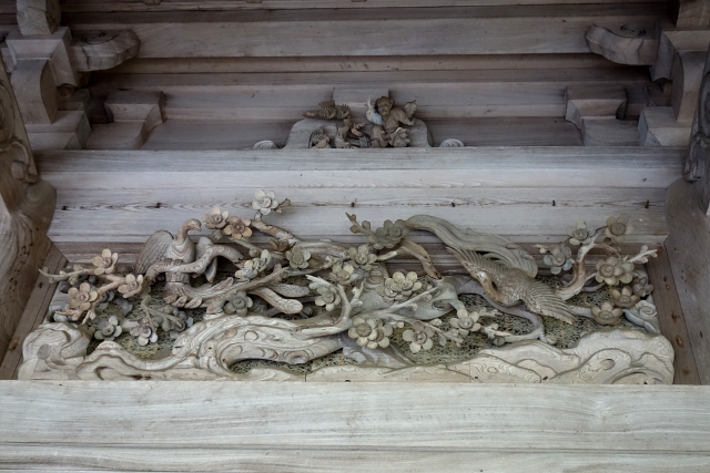 繞殿轉了一圈出來,我踏階走上「本堂」的外廊,之前在遠處由於墨簷披垂,僅見牆色,以為殿體便是真的質樸無華。但當在外廊一抬首,才發現樑架皆刻著雲紋,架間的額板浮雕出松櫻,有鷹鶴昂首展翅,極度繁麗。此類的花鳥雕飾延伸至間斗束及斗栱,讓我尚未入殿,便瞠目盯瞧許久。