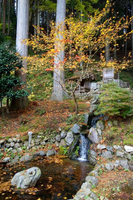 在「本堂」靜望並默禱之後,我退出殿門走回至參道。道旁與鐘樓間的坡地被闢成小庭園,園裡種了些矮楓,但就如我在大門外望見的,僅剩幾片焦葉還不捨離開枝頭,旁樹也同樣枯枒高劃,把庭院渲染成一片寂寥。晃了進去,苔原間溪澗嗚咽,引人覓其源頭,我循著徑路往前拐,原來,涓溪來由自一道小水瀑,正輕聲由坡岩滑墜作響。