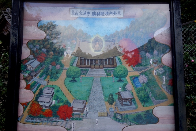 走出大門,映入眼簾的是訪院前就引我端賞許久的彩楓,從這角度看去,剛好有長牆後的「勝林院」與之同景。院的全名其實冠有「魚山大原寺」,上堂是比較偏遠的「來迎院」,下堂才是我現在所望的「勝林院」,為「魚山聲明」的鑽研之地。「聲明」這詞初看很容易誤解,但換作我們熟悉的語彙其實便是梵唱,而「魚山」為它在中國的發祥地。「天台宗」傳承的「魚山聲明」據說影響了日本的世俗音樂,很令我好奇當僧侶齊聚,經語隨曲節頌揚,會是如何令人嘆懾的場面。