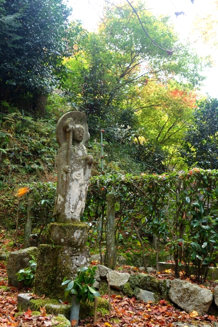 走到了殿後,一道石階延續步徑,劃往堂閣背倚的丘坡,帶著碰運氣的心情我爬了上去,果然,在幽靜茂林間還殘有尚未凋萎的楓樹,有的黃綠得輕揚,有的橙豔得炫目,連地上落葉都還未褪去被灼吻過的痕跡。我看了看靜立一旁的地藏菩薩,其嘴角輕揚,彷彿這兒是他特意留下的一片景,儘管訪者稀寥,依舊候著有緣人與之相會。