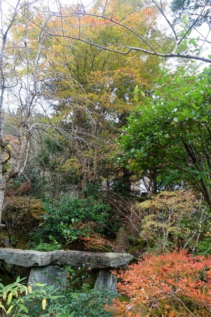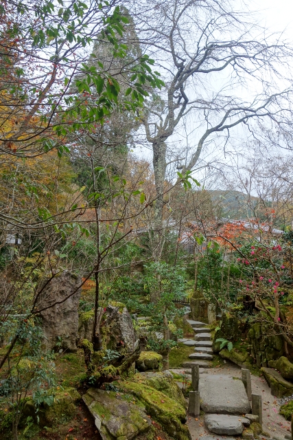 道了謝後,我走進大門,門內橫展的小徑有著指標,要去「寶泉院」得往右,但左邊又標了個「寶樂園」引我好奇,於是便先朝那邊探去。走了幾步,地勢在前方跌降為陡坡,或許原本只是讓群樹恣意生長的丘地,但不知哪位名家施了巧手,將其整理為高低錯落的小院。