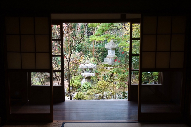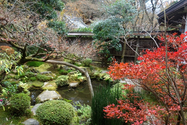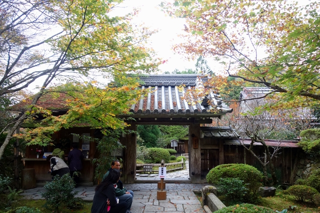 依照地圖的指引,我沿著「三千院」外參道往裡行,參道的尾端,一道矮牆門圈住一方開闊院落,古樸廣殿偉立,看了看牌額,是「勝林院」,並非我的目的地,再認真辨了一下,原來要去「寶泉院」還得往左邊小徑拐。於是我一路鑽到了最裡,果然,它就藏在蓊鬱植林,院牆以褐木拼組,門簷小巧墨深,看來便似民宅般低調。
