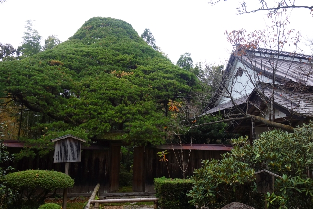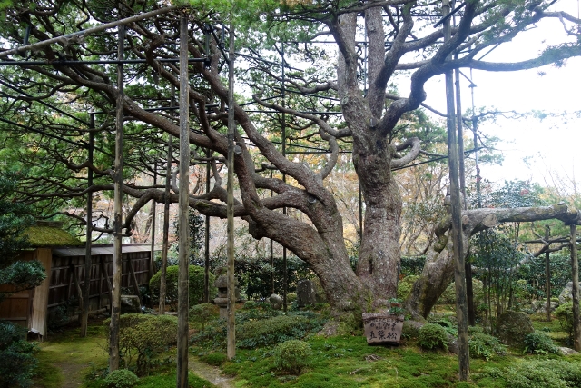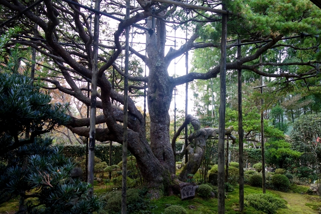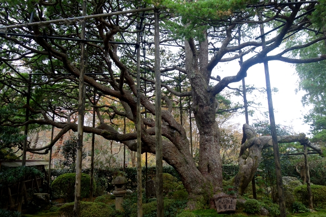 最早進來的時候沒特別留意,現刻再走過,才發現舍牆後探長著一棵巨樹。「寶泉院」最知名的為裡面的五葉松,看來就是這株了。只是一般網誌照片多是它由屋裡廊下望見的模樣,我沒意料到原來從外遠觀是這樣的形貌。感覺像有被特別修剪,茂密的繁葉竄聚成嶺,宛如富士山勻稱映顯於空。
