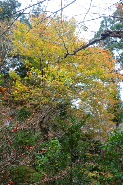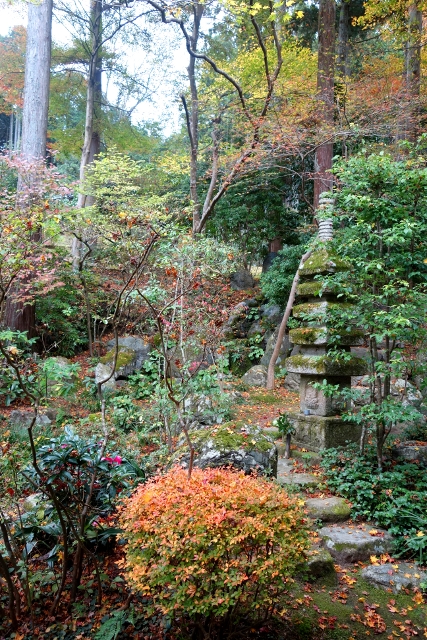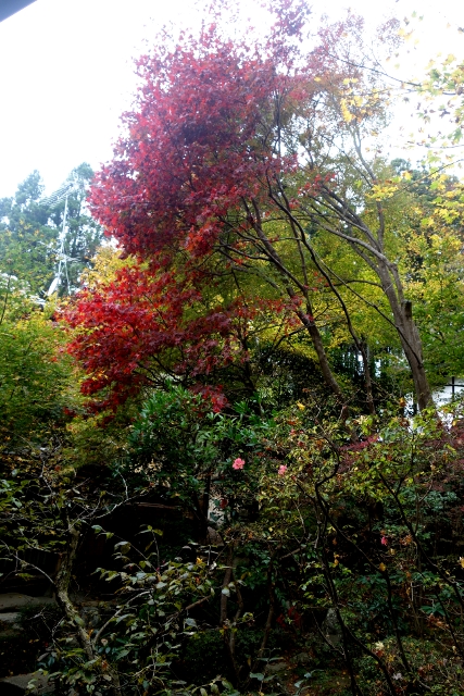 也因為如此,反倒是院外的楓色先吸引了我目光。其翠碧的群葉正開始轉黃,尖梢則已現出鮮亮的豔紅。未能見識「三千院」最美秋景的我自是拿出了相機,拍了一張又一張,待比我晚來的遊客都已超車進入院裡,才走到售票亭比了一。