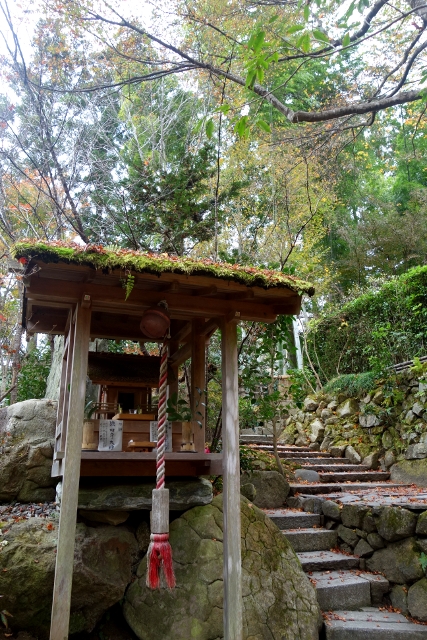 再往前,小小的簡木神社架於岩上,掛鈴垂著紅白交捻的搖繩,儘管質樸,在這園裡卻別具風味。特別的是它的屋簷,被一層翠嫩草苔攀附,由於楓季方過,紅褐的落葉又加添了一重妍彩,相形被刻意理掃過的沙原,這兒更現顯著秋末的意象。而遊徑至此便替成石階往上,於是我轉過頭,再看幾眼斑葉苔岩交織的園景,抬首端望還映於青空的一小簇楓紅,然後循著步徑,繞回門口的分岔處。