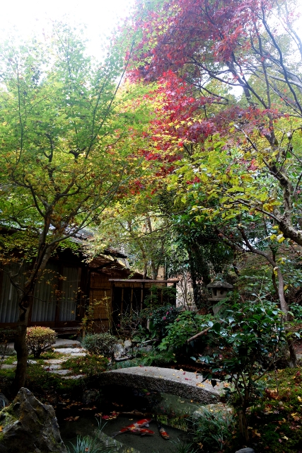 往廊邊的小廳望去,根據地圖是間「圍爐部屋」,中央也的確闢出一方淺沙坑,置上爐架、垂掛著鍋具,兩邊鋪設了席墊。不過誘人的倒是從門口望去的對景,那兒落地長窗往兩邊推敞,映入舍外的碧綠庭景。我觀察了一下,沒什麼禁止進入的標示,便好奇走去探看。而那裡果真別有洞天,小池以石橋搭越,錦鯉悠游,石燈籠與植林繞生成一片清幽。驚喜的是,假使沒走進一瞧,還不知有株楓樹在此高擎了豔傘,鮮紅的葉色讓我瞠目抬望。