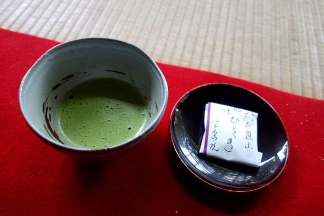 講解散場後,眾人各自找了喜歡的角度續望廊外松枝,而這時工作人員端著托盤躬身碎步而來,盤上為一碗碗抹茶。茶資是本就含在門票裡的,還包括一小份的和菓子,由於觀光客眾多,方才從外經過時,便看到他們跪在榻榻米辛勤用茶筅刷著滿地的茶碗。不過儘管應接不暇,他們的奉茶態度並未因而馬虎,依舊仔細地將茶擱在客人正前,再行禮起身退開。