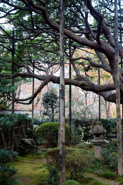 茶湯的份量不多,我輕啜了一些後,打開和菓子包裝,小口小口地將餅送入嘴裡。不太能憶起是怎樣的味道了,畢竟眼前園景吸縛著整個心神,「血天井」的故事亦讓我怔忡。那因戰禍而殞命的血魂會不會還停棲於此,抓著憤怨,就算佛語洗滌仍不肯投身輪迴呢?不過我倒寧願想著,五葉松的壯偉早化解了戾氣,於是它選擇與幽林同化,靜望冬雪素染、聆聽夏蟬紛語,再也不願沾惹人世的爭鬥殺伐。