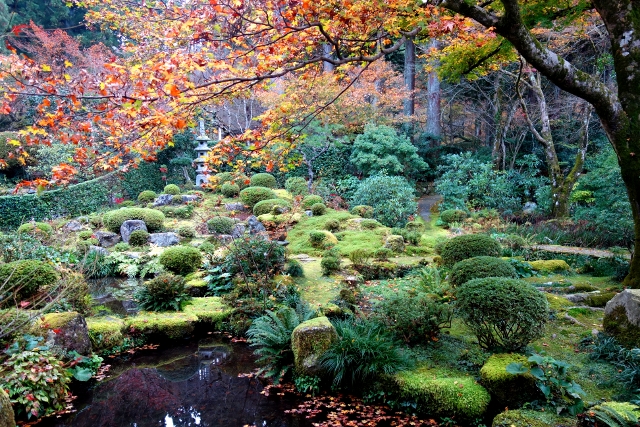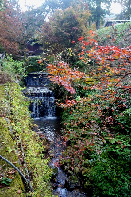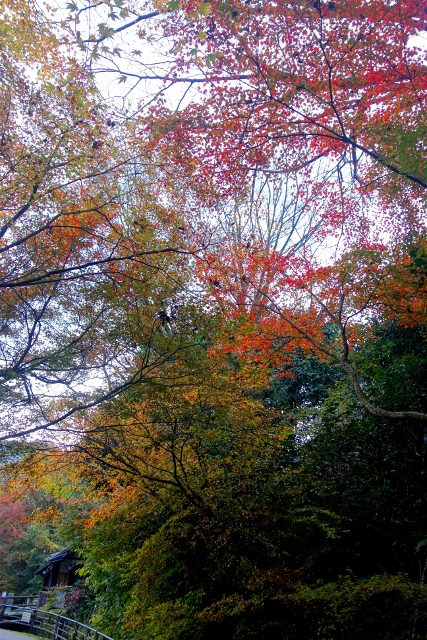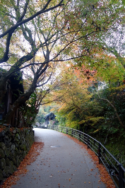 由於是通往「三千院」的熱門行道,兩旁散立了不少門面妝點別緻的商家,不過因為我來得早,路上的遊人僅僅兩三,所以商家仍皆門扉緊閉,難以知曉究竟在販售什麼特色商品。但沒有了人聲的雜鬧,便突顯了鄉路靜謐的幽趣,兼之現刻正是楓紅季節,路邊不時有橙艷的葉串高擎岔生,引我仰觀。走著望著,不知何時,潺潺溪澗開始於旁奔流,我聽著水聲輕歌,看著凋墜星葉將溪岩綴點得紅褐,還未見「三千院」麗景,心中已對「大原」萌生極佳好感。