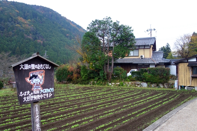 顛簸三十分餘,我抵達了「大原」。走下車往四處望,這兒果然是坐隱於山的鄉野,茂林、田圃,只有在馬路旁才能見著幾間樸實矮舍。找到了指示「三千院」的標牌,我往那兒的徑路探去,一面走,一面隨意看著沿路風景。不曉得是否日本鄉間的居民都如此自持,屋舍雖簡,但牆邊都沒有隨意堆置的雜物,路上更不會出現飄飛的垃圾。更有心者,會在門前擺上幾盆花,甚至堆石植樹佈成一隅清雅院落,很讓人嘆服。