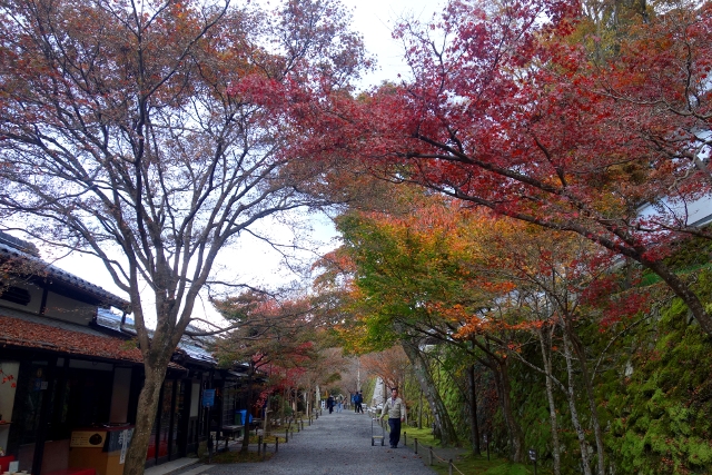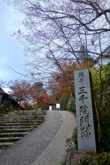一路走到個商家繁盛的十字路口,我終於看到「三千院門跡」的碑柱,而當轉了過去,兩側搭展的楓樹相當令人驚艷,雖似已過色澤最美的時日,但翩落的殘葉翻飛、晃舞,將原本暗冷的屋簷輕覆為溫暖的斑彩,還是讓我不由自主停佇定目。
