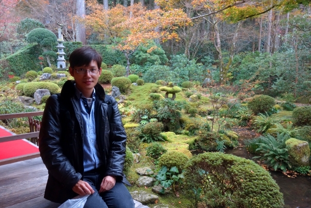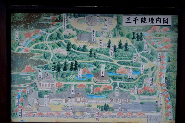 再往前多走幾步,便來到寺院的入口「御殿門」,它架立於階台,兩側石垣上又高築了一層白色灰泥牆,讓人有行臨城郭的錯覺。昨晚參訪的「青蓮院」為隸屬「天台宗」的門跡,「三千院」亦是,從「平安時代」末期,便陸續有皇族在此擔任住持。但它最早僅是「最澄大師」於「比叡山」梨樹下建的小舍院,之後寺名由「圓融房」、「梨下房」等不斷換替,地點也隨之遷移,一直到明治維新後,才落腳於現址,成了現今大眾熟知的「三千院」。而這樣的名稱,想必是出自佛理中的三千世界吧。