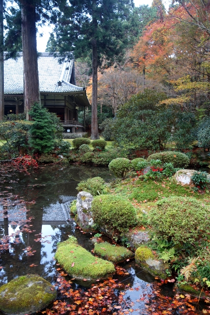 儘管廊道佈置平淡,但當穿至「客殿」大廳,見開敞廊門將殿外園色接迎而進,目光便頓時一亮。我欣喜地加快步伐湊往遊人停集的廊下,望著這片被稱作「聚碧園」的小院落,一如其名地,它以深深淺淺的翠碧之色於池畔繪抹,幾塊斑岩在水光邊露了輪廓,但更多的是被嫩毯般的綠苔覆掩,其上是一簇簇植依一起的矮灌木。它們被修剪得渾圓可愛,像應和著佛理,象徵人們因修持而磨去稜角,處世也隨之圓融。