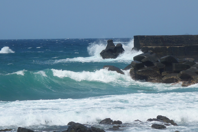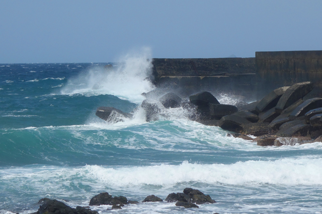 但到了港口,就看到海浪瘋狂拍擊著堤岸跟消波塊,激起超高的浪花。