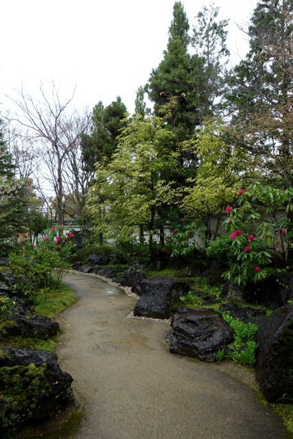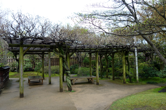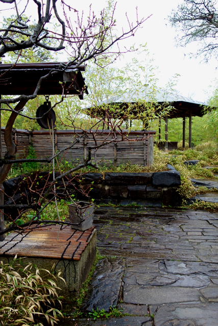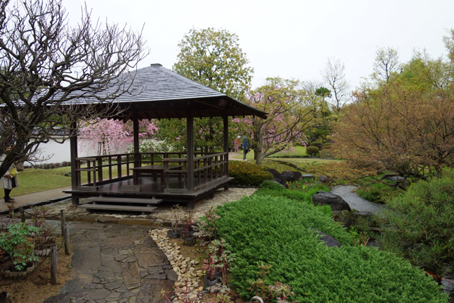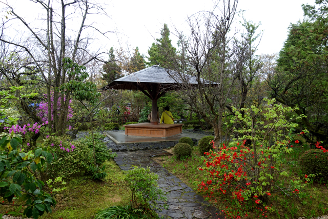 不過當步徑一轉,伴隨幾朵艷花探首,「花之庭」的群芳爭妍漸化入視界。徑旁的解說木牌詞文揚灑,點明此處花種有著歷史典故,但只辨得出漢字幾許的我,僅能藉那些人名胡妄解讀了。庭院正中,「花笠亭」孤立,質樸的結構彷似不願分去遊人目光,欲將輝華留予園間花顏。而在這雨落不歇的午後,也的確是個舒泰歇腳地,當憩坐靜望,幾簇斑紫間碎雪點灑,再一轉眸,嫣紅瓣蕾在碧叢舒展身姿,忍不住想著若春光再甚,應更是片華炫之景吧。