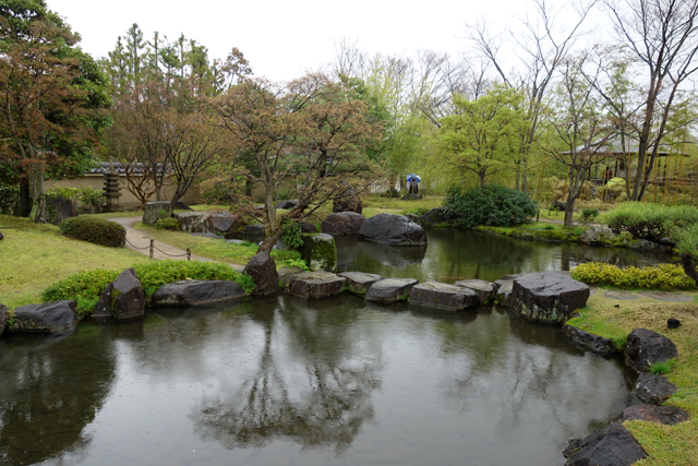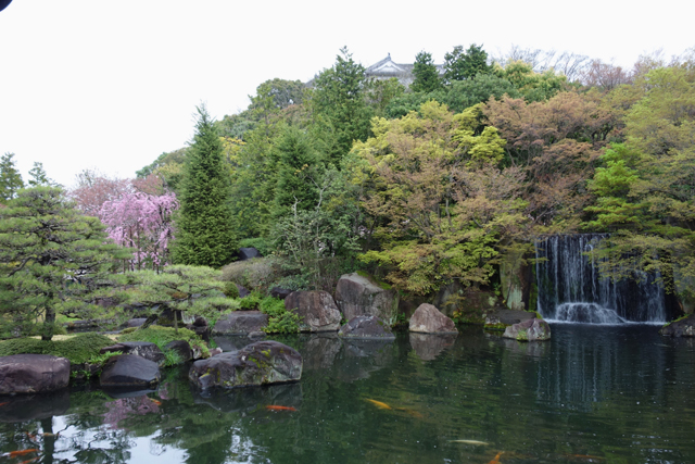 屋裡雖因人群聚留顯得擾嚷,但外處的景緻倒是清幽,砌石自林間參差疊降,引落涓溪墜流為層簾。溪水歡歌宛轉,在幾個曲節之後散闊為廣池,池內島岩松枝昂立探首,邊側丘林水瀑沁然披垂,隱隱地,還有「西之丸」的城垣於樹梢透顯,勾畫牆閣之瓦簷。